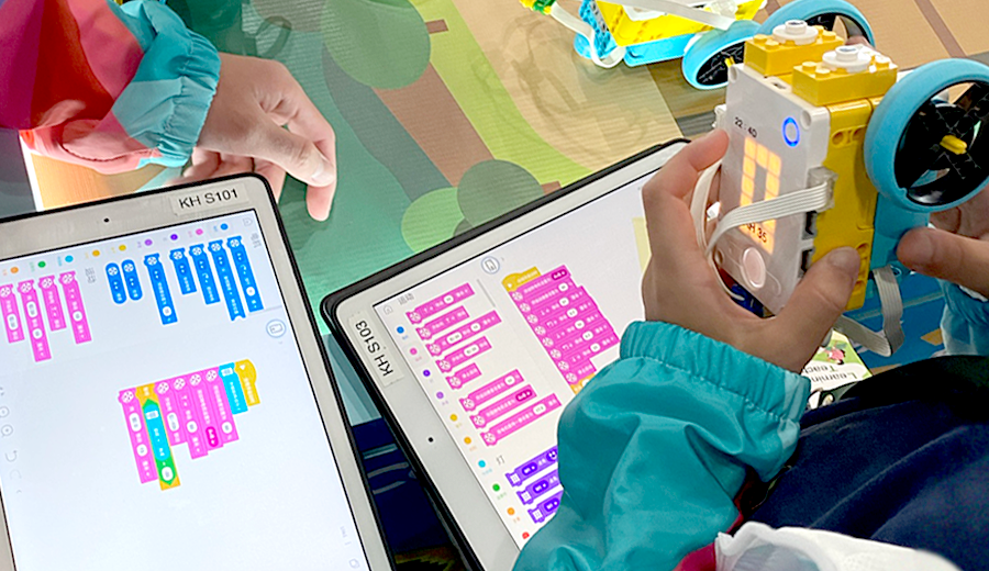 將線上編程指令實體化!學生將編程指令控制以 LEGO® Education SPIKE™ Prime 套裝所搭建的模型,並即場根據實境資訊及觀察模型的反饋來優化程式